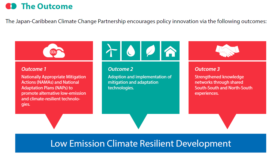 The Japan-Caribbean Climate Change Partnership (J-CCCP) was designed to strengthen the capacity of countries in the Caribbean to invest in climate change mitigation and adaptation technologies in a structured and prioritized manner, guided by their Nationally Appropriate Mitigation Actions (NAMAs) and National Adaptation Plans (NAPs).