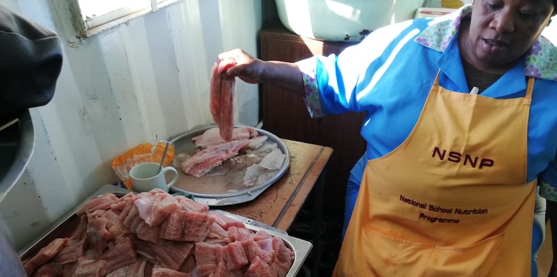 A cook prepares the fish grown with the aquaponics system as part of one of the school’s nutrition programme. Photo: INMED South Africa